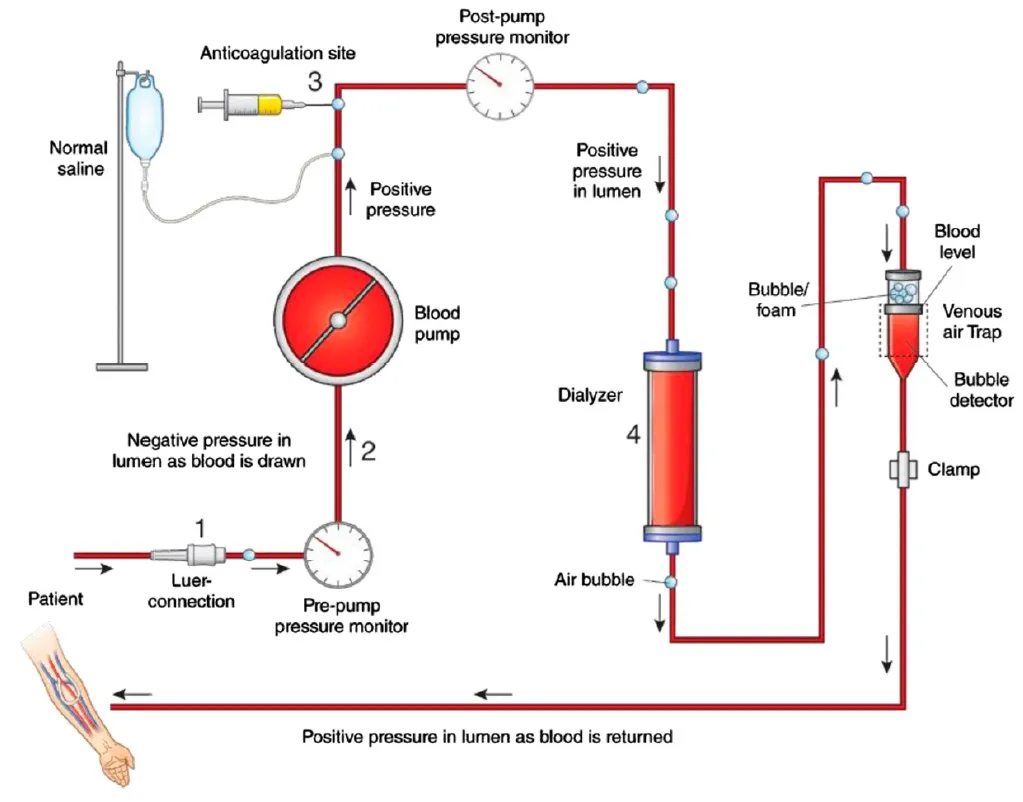 Figura 1. | O embolismo aéreo venoso pode surgir de quatro possíveis áreas de entrada de ar no circuito de diálise. (1) Uma conexão quebrada ou frouxa entre a agulha arterial e o tubo pode resultar em entrada de ar, pois esse segmento possui pressão intraluminal negativa. (2) Um orifício no tubo arterial pode aspirar ar para a linha arterial. (3) A entrada de ar pode ocorrer durante a administração de anticoagulantes ou solução salina. (4) Um preparo inadequado do circuito pode resultar em entrada de ar pelo dialisador ou tubos de diálise. Uma rachadura na linha venosa não causará entrada de ar devido à pressão intraluminal positiva. O ar que entra no circuito chega ao cata-bolha venoso, formando espuma ou bolhas no topo do nível de sangue. Assim que o nível de sangue na câmara da armadilha de ar venosa cai abaixo do nível do detector de ar, ele dispara imediatamente um alarme e interrompe o fluxo de sangue. Consequentemente, o embolismo aéreo venoso ocorre devido a erro humano.